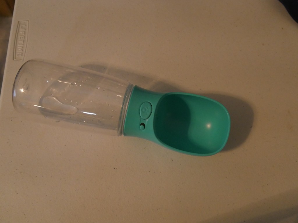 It really is a handy little tool. It allows Happy to have his own dedicated water supply and an attached reusable bowl. We fill the bottle with some ice water and whenever Happy is thirsty we just have to push a button and the little bowl starts filling up with cool water.. But best of all, if there is more water in the bowl than what Happy wants, all we have to do is slowly tilt the bottle back up while pressing the same button we used to fill the bottle, and the water left in the bowl will go back into the bottle. This is great because many times we would fill the bowl and Happy would only drink some of the water and the rest would have to be thrown out.