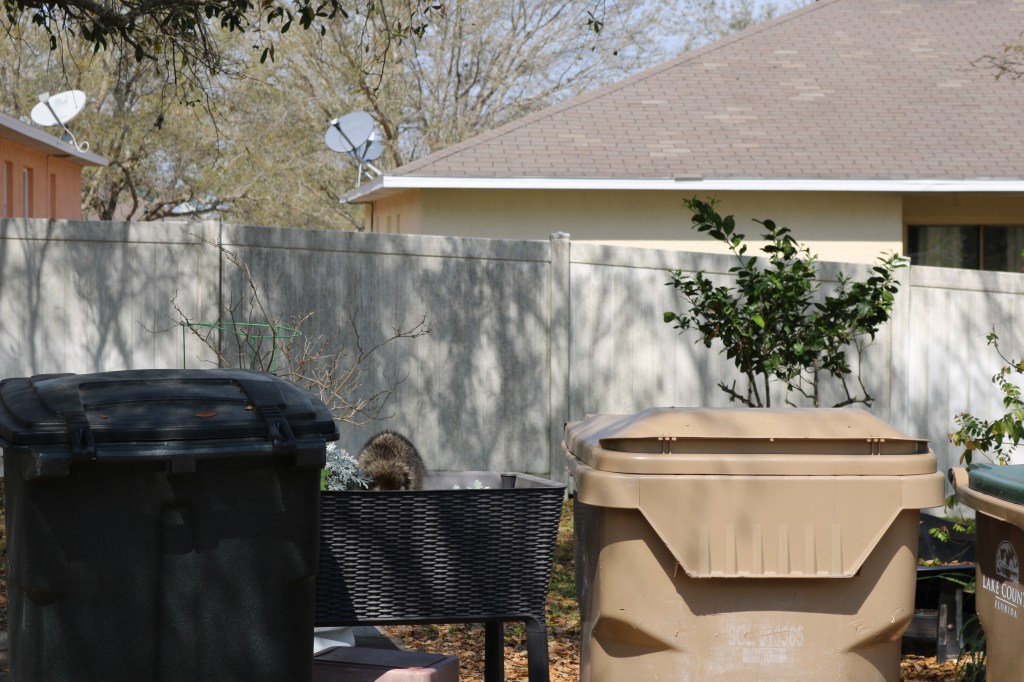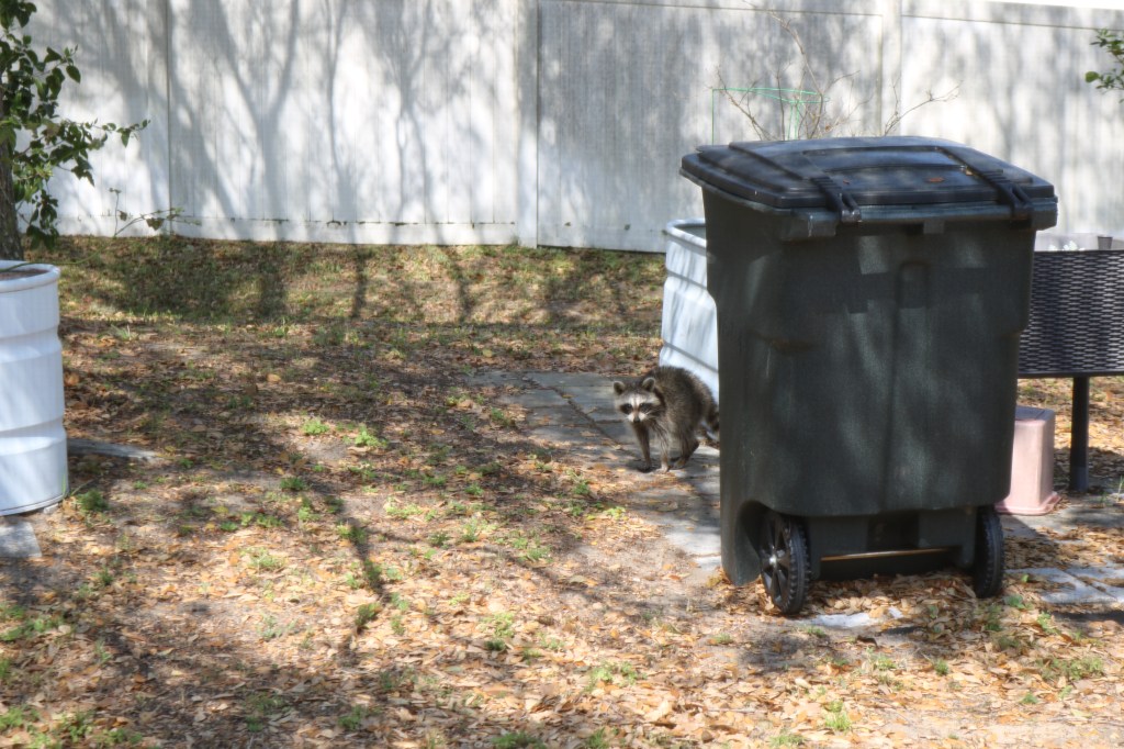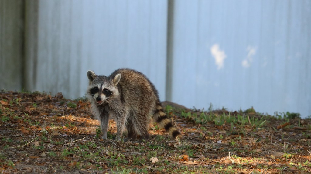 But probably the biggest surprise of all is the newest visitor to Happy’s little backyard zoo, a raccoon. That is right, our yard has been graced, almost taken over, by a raccoon.