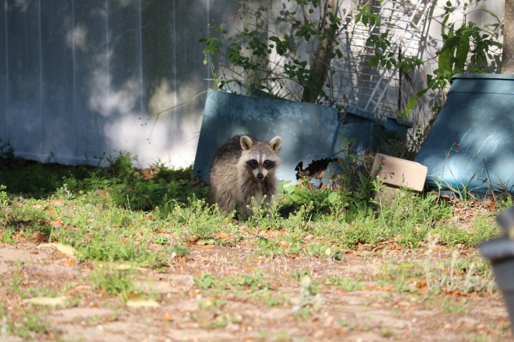 This new visitor has made itself so at home in our yard, that yesterday, when my mother went out back to start preparing our garden boxes for the move to our new home, she could barely do anything because just as she came outside to work, the raccoon came down from its perch in the tree to find a meal. There she was with shovel in hand, unable to do anything while the raccoon took its time enjoying a meal, playing in our garden boxes, and smiling for the camera.