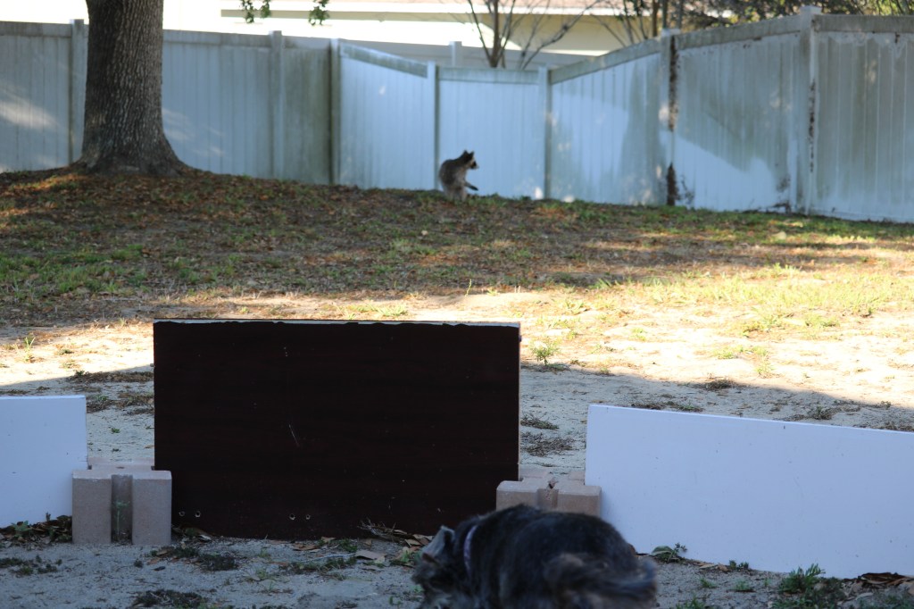 Finally, the only way that she was able to get some work done was for me to sit on a chair in Happy’s corral and watch the raccoon while she worked on a garden box a safe distance away. Once or twice I had to let her know that the raccoon was headed her direction, and she would nervously rush away while the raccoon paused, and then returned to its meal or play.